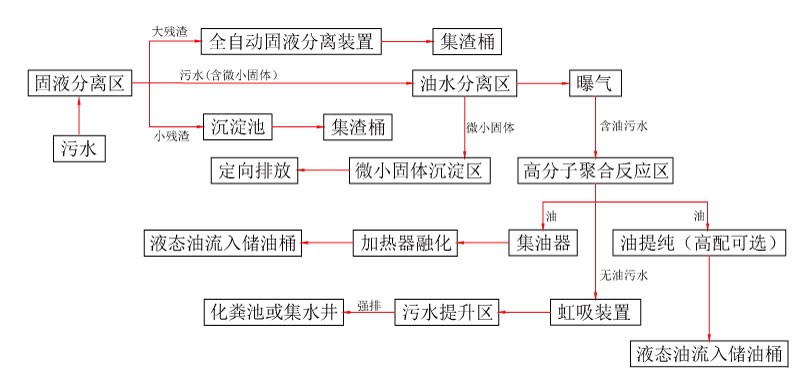 ① 三栖分离:油、水、渣三栖分离,整个设备是由固液分离装置、油水分离装置、污水提升装置三部分组成。模块化设计,外观优美,安装方便,维修简单,具有可升级能力。